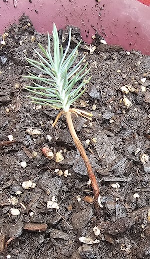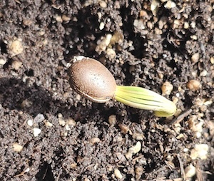 I live, at least partly, in the woods; piñon primarily, representatively considered piñon-juniper, but I have only a small handful of juniper, a larger sprinkling of Ponderosa, and hundreds of piñon. The birds like the piñon seeds along with a lot of other wildlife, and they periodically drop one in my various gardens and potted plants that I have in what I call my “yard,” a small area around the house; the rest of my a little over 6 ½ acres is left wild. I came upon the one starting to grow when it was just emerging from its seed similar to the top photo.